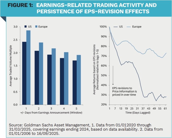 These inefficiencies lead to information travelling more slowly in Europe, sustaining pricing anomalies longer. Momentum signals have historically shown stronger and more persistent efficacy in Europe compared to the US. Trading activity in Europe spikes more around earnings announcements, suggesting greater informational value concentrated in formal disclosures, and the market’s reaction to sell-side earnings per share estimate revisions also decays more slowly: after 63 days, the average daily realized excess return attributable to such revisions remains at about 73% of its initial five-day impact in Europe, versus falling to 28% in the US. Together, these features point to a less efficient mechanism and a longer window to exploit informational edges.